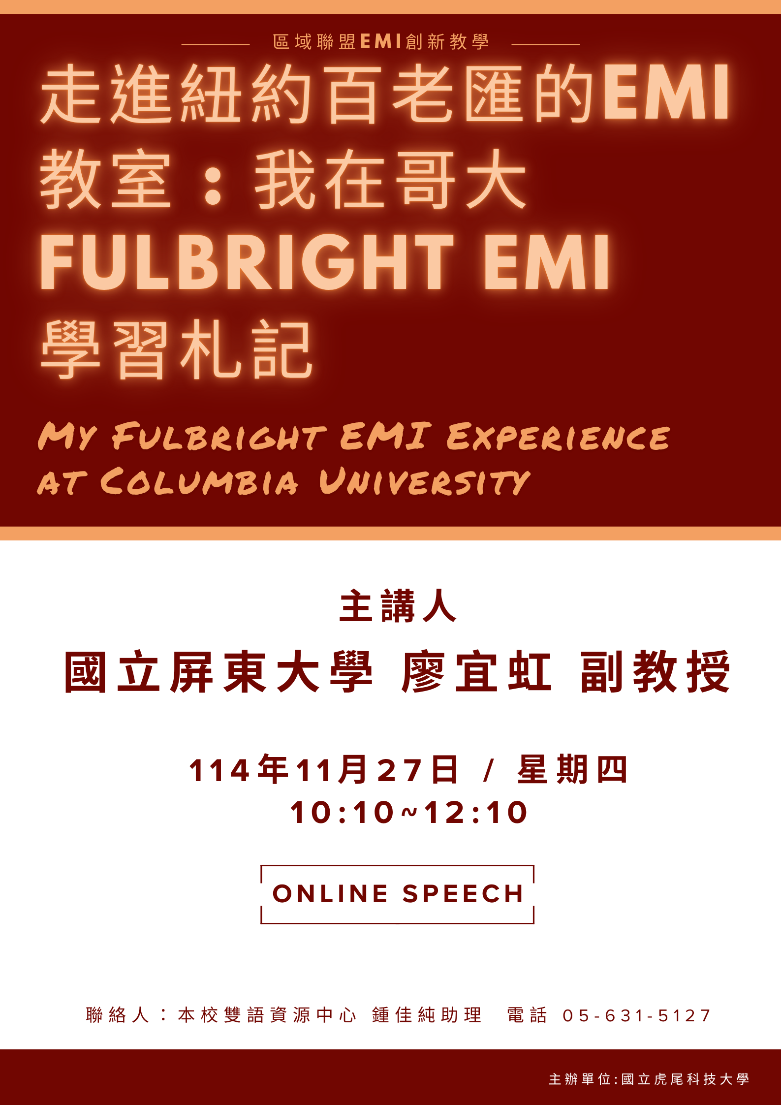 背起傅爾布萊特的行囊,走進哥大教師學院,從台灣到紐約,從課堂到世界。跨文化的對話與學習,為 EMI 教學注入全新能量。透過教師培訓分享,提供多元視角,紐約精神如何開啟不一樣的EMI國際橋梁~