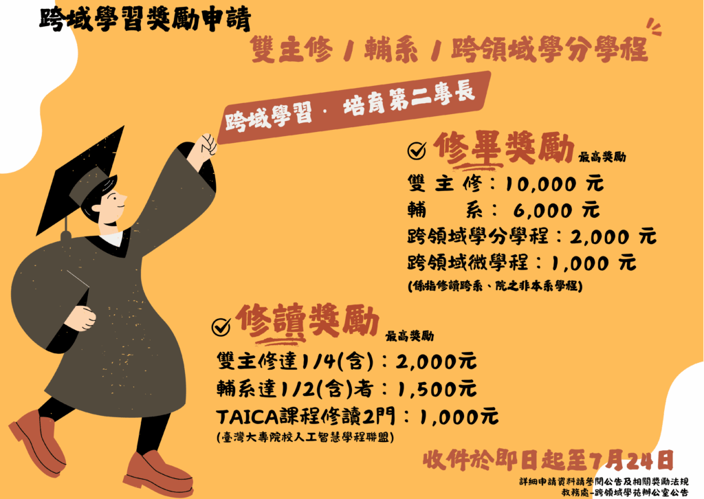 想學得更廣、更深,邊學習還可以拿獎勵,教務處【雙主修、輔系與跨領域學分學程獎勵】上線囉~